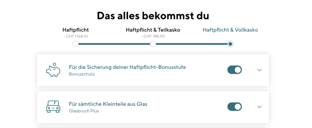 Im zweiten Schritt kannst du noch dein Versicherungsangebot anpassen und gewünschte Zusatzversicherungen auswählen.